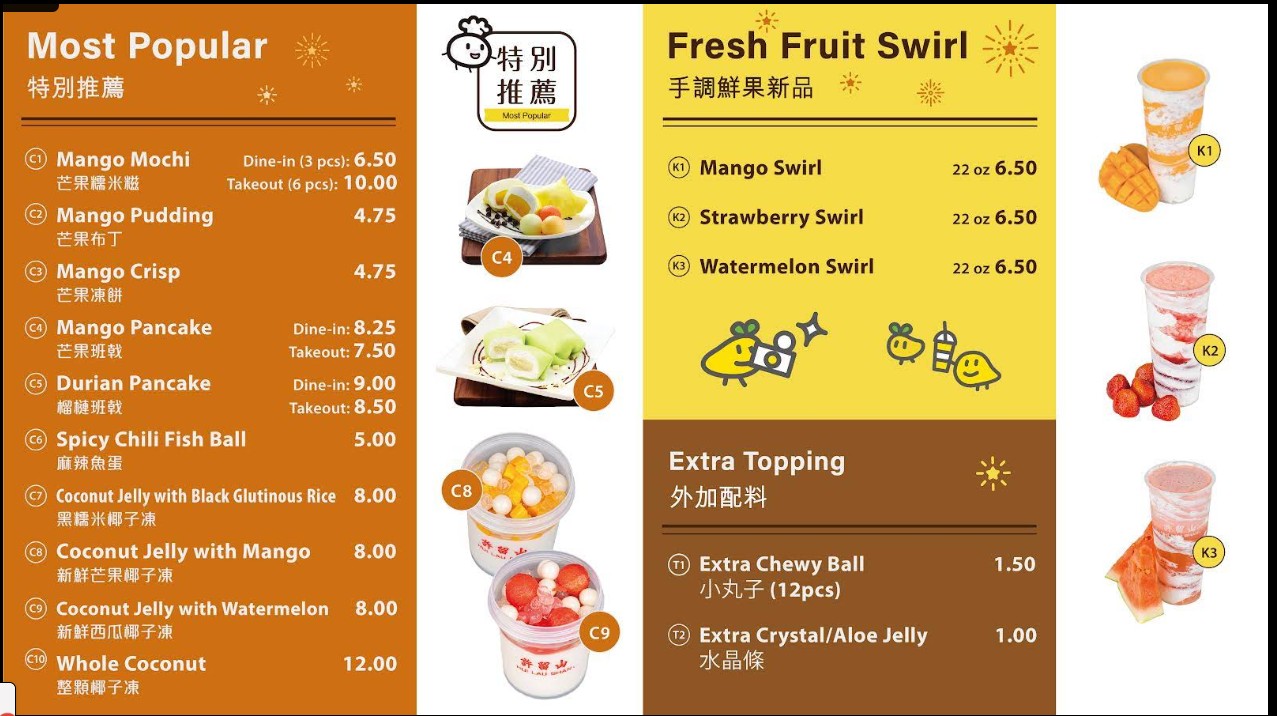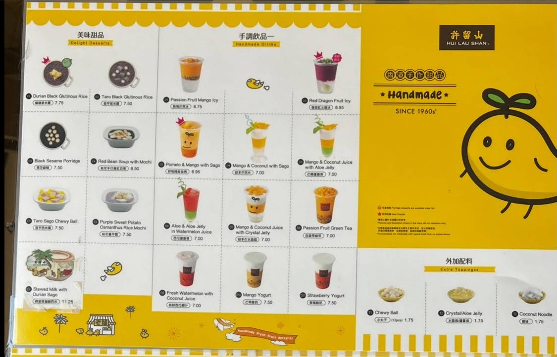 Welcome to Hui Lau Shan, a famous Hong Kong dessert brand known for its signature mango-based treats and refreshing beverages. The Hui Lau Shan Restaurant menu offers a wide selection of traditional and modern desserts, including mango sago, fruit bowls, herbal jellies, and specialty drinks crafted with premium ingredients. Located in Cupertino, this dessert destination is perfect for anyone craving authentic Asian sweets in a cozy and modern setting. Whether you’re dining in or taking your treats to go, Hui Lau Shan delivers a unique and satisfying dessert experience.